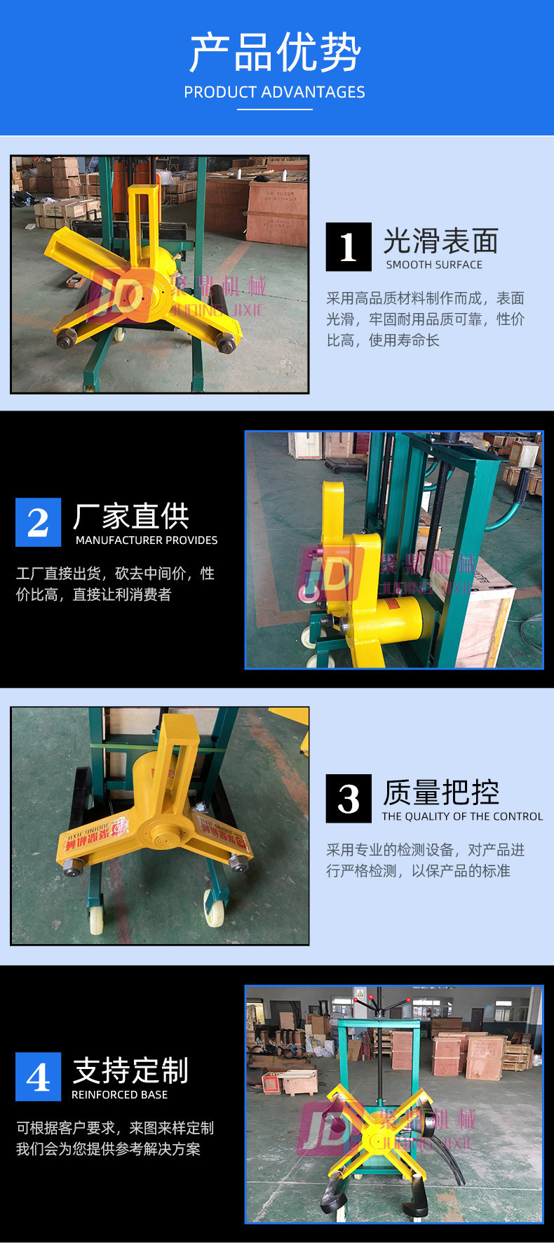 本機系參照裝卸叉車而設(shè)計的,底部為四個鋼質(zhì)萬向輪,經(jīng)久耐用。